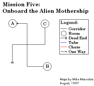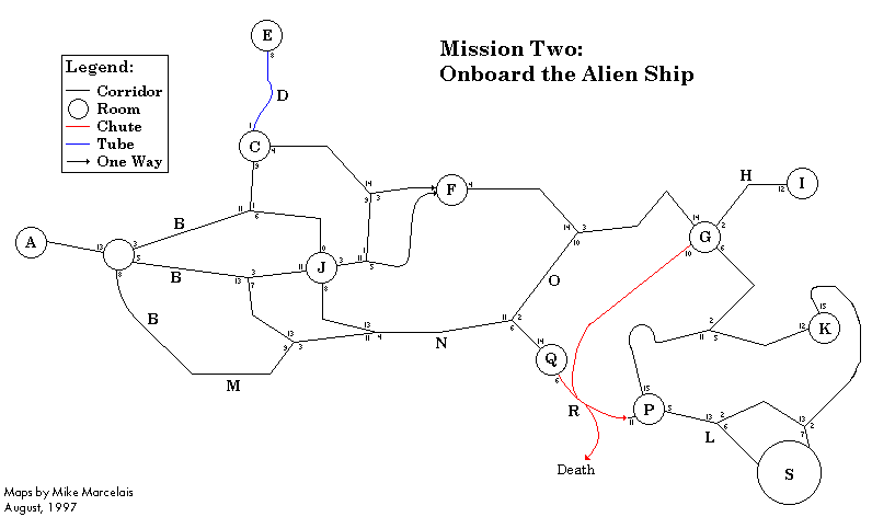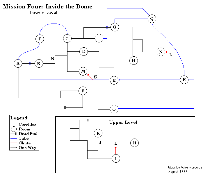 There are three kinds of corridors. The "normal" corridors are colored in black and are what you would expect from corridors. "Tubes" are colored blue and are narrow and winding passages. Not all of the turns are drawn on the map; only the entry and exit points are noted. You cannot turn around when you are in a tube. "Chutes" are colored red and are very much like tubes. Chutes are very steep and you can only slide down in one direction.