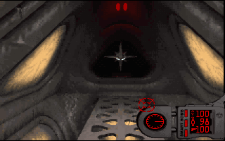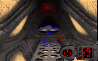 P: Two large doglike creatures appear in the corridor here. Note that the health meter for the monsters is initally set at 200%