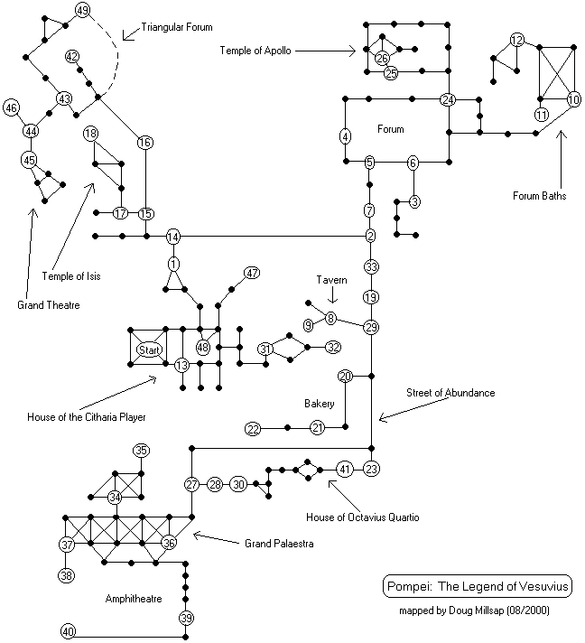 Most, but not all, of the "nodes" in Pompei's game world are represented on my map. I did not take the time to plot every node within the Forums and Temples. All nodes of importance are represented by a circled number, and these numbered locations correspond to the numbers in parentheses in the following walk-through. Please note that not all of Pompei's locations are accessible at all times.