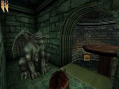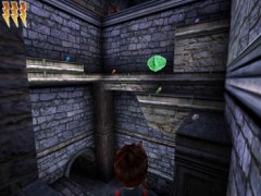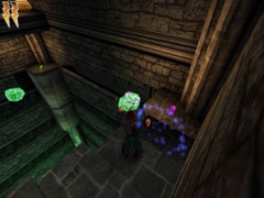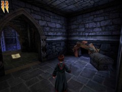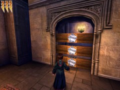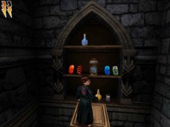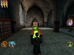 The two chests in the corners each contain a Chocolate Frog. Ride the beam downward and jump to the middle window. Inside is a cauldron to flip aside for BB Beans. Cast Lumos on the Gargoyle and watch a cut scene on the gaps between the stairs in the lower passage.