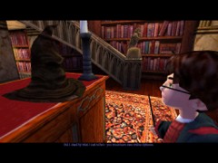 down to ground level. Walk up to the desk where a Wizard hat is lying: