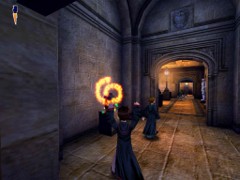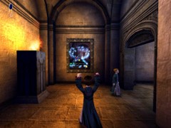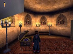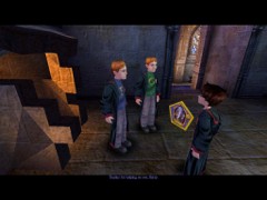 Cast Alohomora on the chest and take some Beans. Go out and continue to your right. Two Slytherin guys - Crabbe and Goyle - will stop Harry.