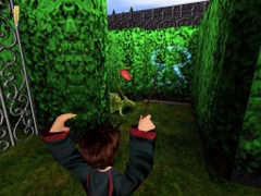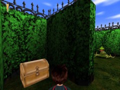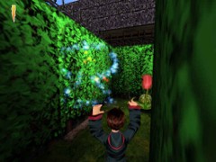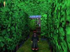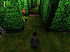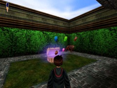 Enter. You can go left or right around the corner. Open the chest with Alohomora. Take out a Choc Frog and a Bean. Then, turn around and notice a brown pad under the middle of the hedge. In fact this pad is the end of a gravel path sticking out from the other side of the hedges. Keep an eye on those pads in this sublevel. They indicate an accessible Secret Area. Cast Alohomora on the hedge section above the pad.