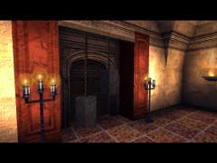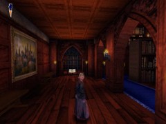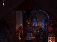 from the table to the bookcase and jump over the banister. Proceed to a door