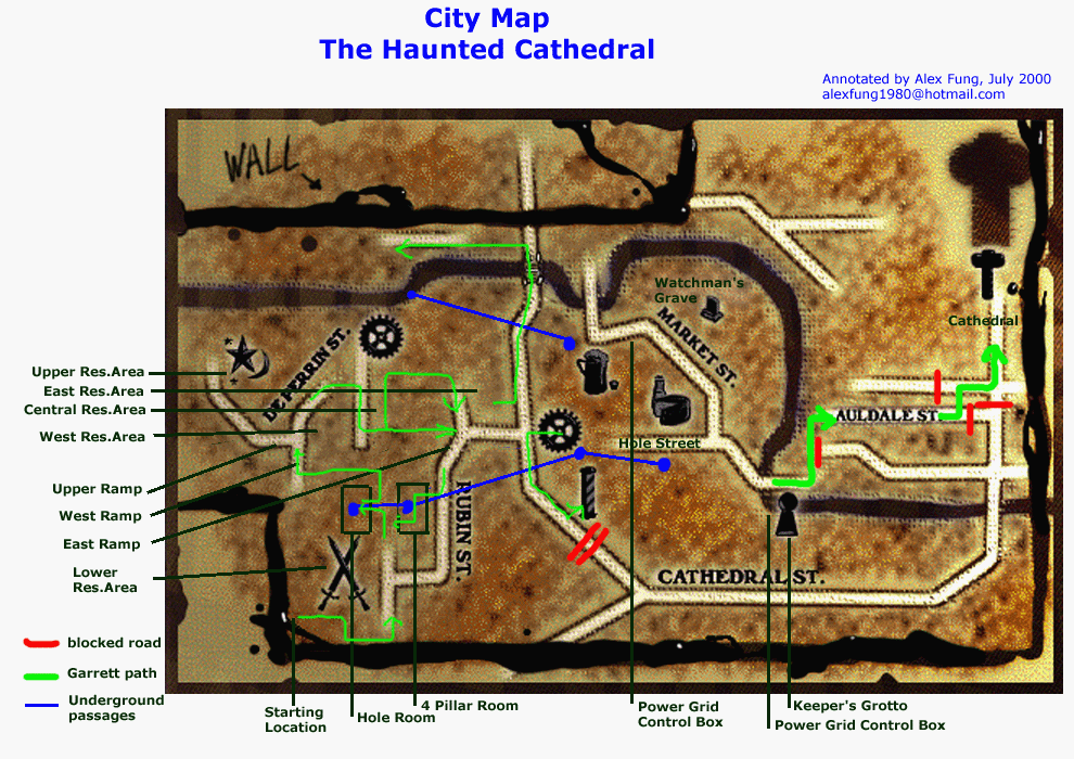 Turn right and move up the slope. You are now at Auldale Street. Walk past the street sign and continue forward. The street turns right and arrives at a dead end. So instead of turning, move forward through the broken wall into a small room (it is not easy, because the ceiling is low and the hole is narrow). Turn left and exit the room. Refer to the annotated map, you have passed from Audale Street to the street on its North (parallel to it).