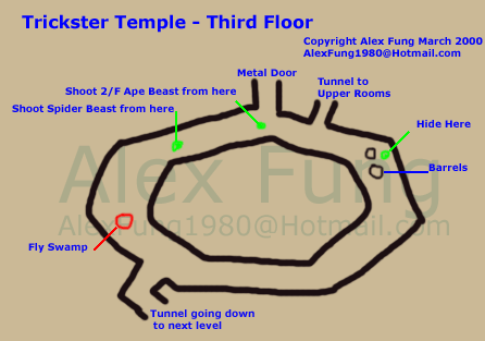 Take the scroll of maps and the Blue Key. Now you can see the extra map pages of the Tricker Temple. The Blue Key opens the unpickable door on Main Shrine Third Floor, so go there. Before you leave, notice that here is one of the few places you can kill Hammerites (and your mission).