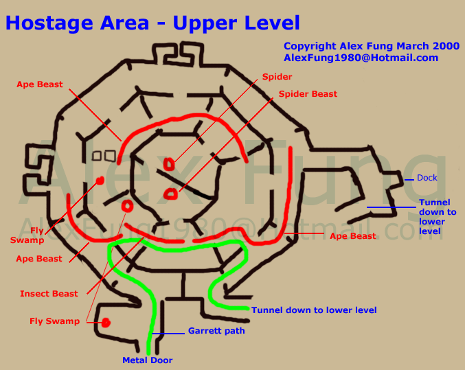 Despite the noise, you are safe here. Refer to the map. The corridor in front of you is circular and you are on the South side. Check your left for a patroling Ape Beast, and go to the dead end on your right. Peek into the window opening: you can see a tunnel on the right leaving the circular corridor. That is the path to the Lower Hostage Level .