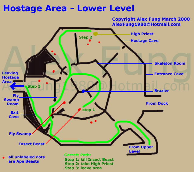 You arrive at a big cave (Entrance Cave) with a camp fire in front. There is no need to put it out. The High Priest is in the Hostage Cave on your right (North), but an Ape Beast is always looking at the South cave opening. If you have two remaining Gas Arrows, you can knock them out and take the High Priest now. And with the High Priest, you can skip some of this whole level and carry him back to the Hammerites. You can either carry him back to the Hammer Tuff where you got the map and Blue Key, or at Normal and Hard Difficulties, you can carry him to ride the raft. However, the last Insect Beast is in this level, so if you have triggered this mission objective, you have to at least hunt her down before you can leave. So for those who have sufficient Gas Arrows and have not triggered the Insect Beast objective, they can leave right now. For those who have triggered the Insect Beast objective but have sufficient Gas Arrows, the plan is like this: if you can gas the Ape Beasts and take the High Priests now, you have two choices depending on which exit you take. If you want to take him back to Hammer Tuff, it means you will go back to the Upper Hostage Level, so you can just leave him here. If you want to take him to the other exit (which is nearer), carry him with you. In either case, we are heading to the Insect Beast, but the second approach is better since you will visit more new places.