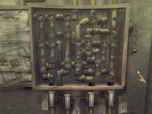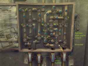 The second pictures show you which valve should you moved (M). After you solve the puzzle, pull down the lever on the right side. The water should flow to the pond right now. Go there and talk to Vera. Someone or something is inside the pond right now. My God, it's a gargoyle. Talk with him and enter .........