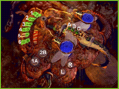Once inside, go to the far right-hand side. Notice the transport tube oozing out the green fluid. In your Inventory, get the sound generator, and click it onto the transport tube; watch the video sequence. Then, listen to the "tune" that you hear when he enters the door in the video sequence. Then talk to the cyclops-bug; go through all dialogue choices. Then click on the children/ clones that you see in the cages beneath you; click on them with the talking icon to listen to their "song". Then, go over to the left to the door that is covered with the tentacles, then click on the object above your head; it's a control panel of sorts, a console. Number the grubs 1 through 5 going in a clockwise order, with number 1 being at the 12 o'clock position. Then click on them in this order: 5, 2, 2, 4, 1, 3. This will open the door to the elevator and take you to the next level.