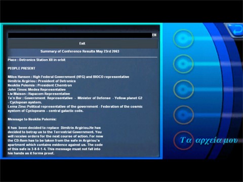 She's also telling that her brother has been dealing a lot with Bioco lately. Nick interferes by asking her if she means Chemtron. She never heard of that company before. She tells you that if you want to check out Bioco you have to use the password destro32. She saw her brother using that password. When Anita has gone, turn on your laptop. Choose Files. Type Chemtron. When you are prompted for a password enter destro32 and press verify. Execute file number 3 to find out that there is a connection between Detronics, Chemtron, Argiriou, Polemis and Bioco.