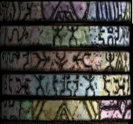 Look at the hieroglyphic writing on the wall. Note that each line of the hieroglyphs has glyphs that are highlighted by different color: from top to bottom - purple, green, red, blue and yellow. Exit and look close at the left column on the foreground. The active cursor here is on the left side of the column. Arrange the column rings to be similar to the different colored glyphs on the wall.