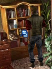 Study - Exit the kitchen and enter the room left of the armchair. Look around. Look-click at the green troglodyte head at the miscellaneous book case left of the door. Martin will mention that Java is hypnotized by this head. Take the head paperweight. Look and right click the magazine rack under the computer table. Take the pen. Take the part of the mechanic's number left of the computer. It is the other half of the torn mechanic's number. In inventory, right and then left click the part of mechanic's number and then click on Diana's notes to get the mechanic's number. Look close at the number and see that the paper is now pasted together. Left click the mechanic's number and automatically, Martin will call the mechanic.