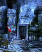 There several stones here: the pointed stone on the right steps, small stone right of the entrance, the deformed stone on the left steps and a round stone at mouth of the face left of the entrance. Pick up the round stone.