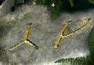 Crab cave: Go forward on the center path and see crabs that will attack if you cross their path. Look left and see a stone owl on the wall missing half its face. Turn right and see a lizard on a post. Talk to the lizard and it will go away. Use the wood stick on the post to divert the log that the crabs walk on. Place the half owl's face on the stone owl. Ooohah!