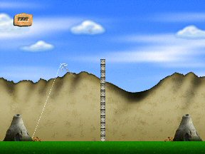 Click on right red button to start the target shoot. The object of the puzzle is to set the correct angle of the line of fire of the left catapult and to destroy the right hut.