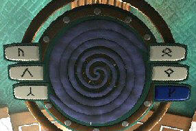 Zanat's garden: Go to the displacer. Press the top right button and then the central spiral. Look at Zanat's statue. It's broken. The garden is unkempt. Look at the broken columns and see a slab with the displacer glyphs on the ground - the bottom left button and the blue button glyph.