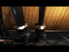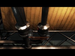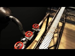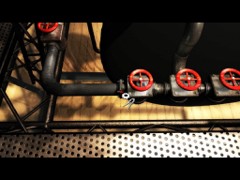 Turn to the right and go one step forward. Turn to the left and go another step forward. Turn to the right and look at the top of the tank. Place the ladder against the tank. Climb up the ladder. Flip the red lever down. Use the crab pincer on the bolts. Remove the bolts with the glass breaker. Do the same with the pipe leading up. Place the intact pipe on the opening. Attach the nuts and the bolts. Head back to the red valves. Open the center and the rightmost valve.