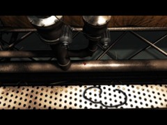 Turn to the left and walk to the bar. Talk to the barkeeper. Exhaust all dialogs. Talk to the woman at the bar. Exhaust all dialogs. Give the small sum of money to the barkeeper. Wait a little until the bottle is getting emptier and emptier and the barkeeper finally falls asleep. Talk to the woman at the bar once more. Step behind the bar and open the brown hatch.