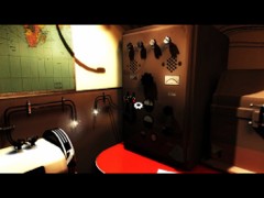 Turn to the right and walk to the corridor. Go forward and walk to the stairs leading down. Turn around and go down the stairs. Turn to the left and walk towards the closed door. Turn to the left and open the closed door. Enter the radio room. Notice that most of the equipment has been sabotaged. Open the drawer of the desk and take the nuts and bolts. Pan to the right and examine the equipment. Exit the radio room.
