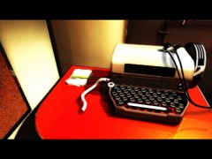Attach the phone cable to the telex. Type your message with the telex keyboard. Take the telex ribbon from the left side of the telex.