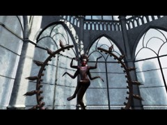 If you have done this correct all nine columns are up, forming a staircase leading up. Go up these stairs. Look up to see a bull's head above the grate. Use the iron bar on the bull's left horn. Walk forward. Look to the left and notice the big rock rising up in the sky with a huge red crystal on top of it. Notice that Elliot is standing behind some sort of panel high up that rock. Finally notice that the bridge towards that rock has been destroyed and is hanging down the rock. So... there is no way to reach the bastard! Walk towards the Ark. Enter the Ark. Turn to the left and examine the huge standing green crystal. Turn to the right and go forward.