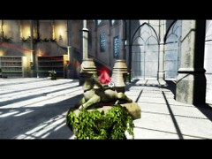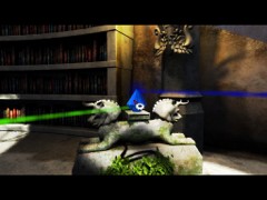Turn around and walk to the statue at the end of the blue beam. Cut the ivy. Place the red ruby on the statue.