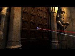 Notice that the red beam is pointing to the door on top of the stairs. Walk to that door. Place the blue moonstone on the doorknob.