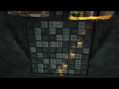 Turn to the left and place the blue crystal on the panel. Now you have to make a blue connection from the upper right spot to the bottom left spot. Alas this isn't as simple as it looks. You'll find a fearsome opponent in Elliot! Each time you make a move in blue, this bastard makes a contra move in red. I can't give you the exact solution to this puzzle because the way Elliot reacts to your moves is different every time. Below you find an example. This is not just an example! With me it worked 9 out of 10 times!! If you fail, just press the red arrow to the right to give it another try. Good luck!
