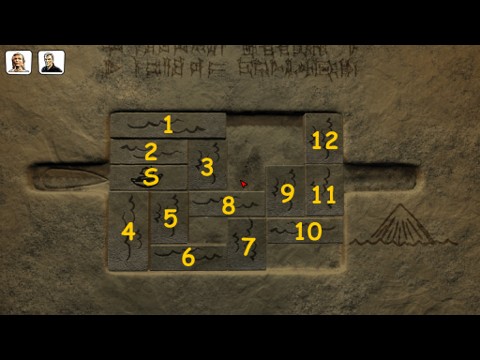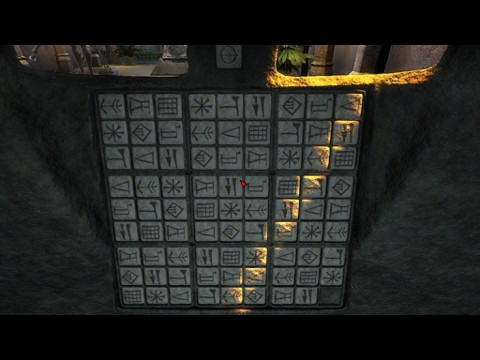 Place the bronze medallion in the eye of the Dragon. You'll pick up a priceless blue Atlantean crystal from the water basin beneath the painting. Don't forget to take back the bronze medallion from the Dragon's eye!!! Turn around and walk to the opposite wall. Click twice with the bronze medallion on the trident. Turn to the right and walk towards the opened panel in the wall. Place the Atlantean crystal at the left side of the panel to activate it. Study the panel and I guess you know the meaning of this one. Yep... you have to move the ship from the left side to the right side. You can move a tile to the left by clicking on the left side and you can move it to the right by clicking on the right side. To move a tile up click on the top part of a tile. To move it down you have to click on the bottom part of a tile. Label the stones this way: