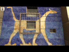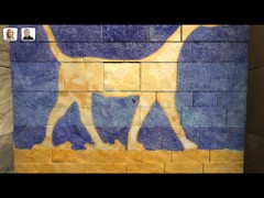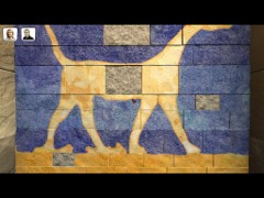 Use the hoe on the green plant. Pick up the red roots. Turn around and go one step forward. Turn to the right and enter the temple. Examine everything you can. Look at the blue-yellow painting on the wall. As Kate explains this bas-relief represents the Dragon of Marduk. Notice that four stones of the bas-relief are missing. Also notice that the seize of the missing stones is different. Now remember that you just picked up four stones in front of the temple. That can't be no coincidence! First we are going to measure the seize of each missing stone.