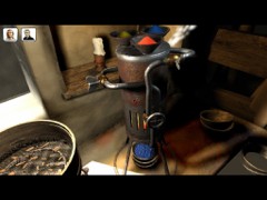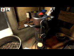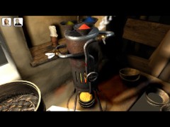 Lift the wooden crate with the iron bar. Talk to the little girl called Jyan. Exhaust all dialogs. Take the smoker from the ground next to the wooden crate. Return to the house with the wheel. Turn around and pick up the wooden bucket. Turn around and walk to the houses at the end of the street. Talk to the woman by the stove. Exhaust all dialogs. Pick up the box of matches next to the stove.