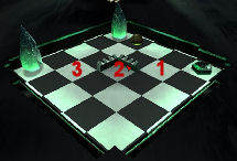Click-turn the serpent ring 3 times. Turn around and see a block of stone rise up. In front of the stone is a dark tile. There are 8 other holes similarly position across from left to right on this side of the room. Hmm...