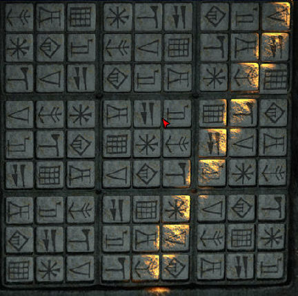 There were 8 torches that looks like precious stones that light the way to the truth (stand) - press the 8th tile counting from left to right. See some block of stones rise and some drop down.
