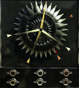 There are 2 rows of 3 dials. The top and bottom dials on the left are yellow colored, the middle ones are white and the right ones are pink colored. Each dials when clicked on the right side turns the corresponding colored arrow above clockwise, while clicking on the left turn the arrows counterclockwise. The top dials turns the arrows 7 spaces while the bottom arrows turns it 5 spaces. There is a block close to the top position that stops the arrows from moving to a full circle.