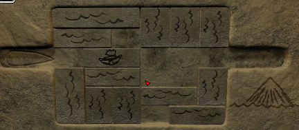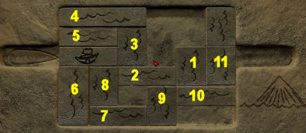 1 up 2xs, 2 right once, 3 down 2xs, 4 right once, 5 right 2xs, boat right 2xs, 6, up 3xs, 7 left once, 3 down once, 8 up 2xs, 2 left 3xs, 3 up once, 9 up once, 7 right 4xs, 3 down once, 9 down once, 2 right 2xs, 6 down 3xs, 8 down 3xs, 4 left once, 5 left once, boat left once, 2 left once, 9 up 4xs, 10, left once and 11 down once. Click boat to the right slot. Door opens.