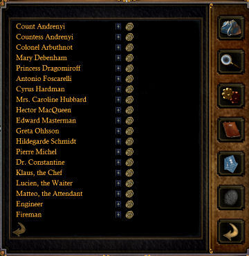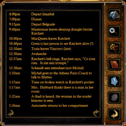 The train departs for Belgrade. Listen to the passengers. Talk to Hercule Poirot during dinner completely and learn about the different characters on board. Ratchett talks to Poirot about hiring him. His life has been threatened. He shows his gun.