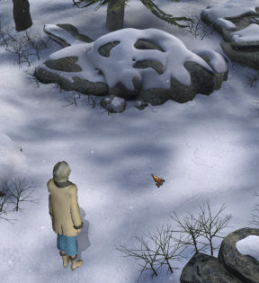 Gameplay: This is a third person point and click game. CD2 is needed to be in the drive to play. The main menu has play (new game), load game, options, credits and exit. The options menu has the music, volume, effects volume, brightness, text captions, 3D shadows, animated effects, fog-haze-clouds effects, particle effects and antialiasing.