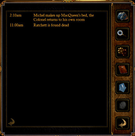 Click-drag an item and place it over the magnifying glass icon: a description of the item is given. This gives additional clues to the gameplay. Also, when book, letters and newspaper clippings are examined this way, the information is stored in the scrapbook.