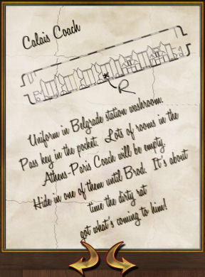Go back to the Calais car by walking there or place the cursor at top of screen. See the different cars of the Orient Express. Click on the lit Calais coach to immediately be in that car.