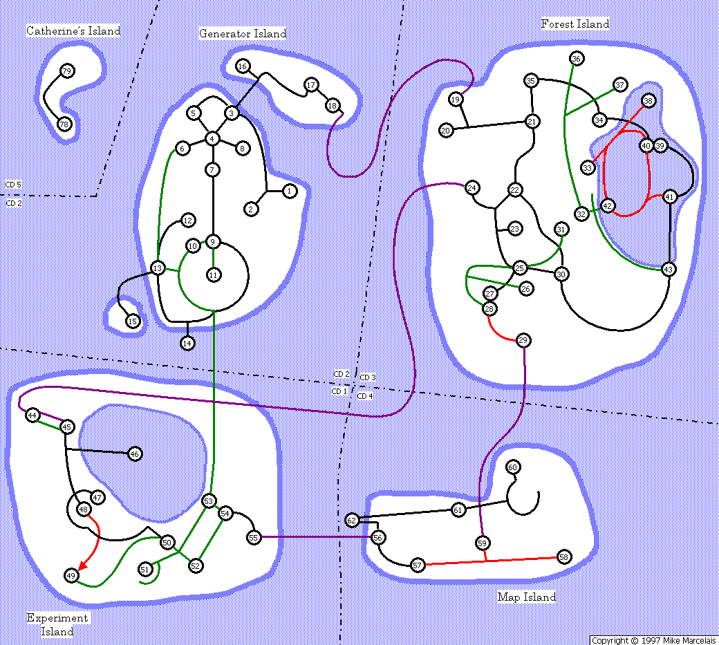 All shorelines (including the edges of islands) are drawn in blue, often with a blue border (or solid area) to indicate the direction that the water extends. Dashed black lines indicate borders between the CDs. Paths which you travel along, but have no direct control over (such as minecar paths) will be shown in purple.
