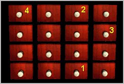 | Note that four of the buttons (3, 6, 12 and 15) have a wooden frame around them. To open the drawers at the bottom, only the four 'framed' buttons must protrude and all the others must be retracted. There are no clues as to the sequence in which to click the buttons, so you have to resort to 'trial and error'. All you know is that clicking a particular button only affects buttons having the same symbol. Also, the order that buttons are clicked in changes the affect of clicking a particular button. | |||