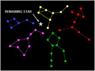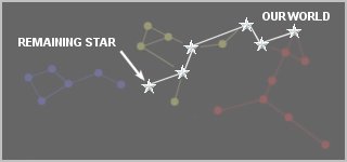 | The remaining star (on the floor galaxy) is where 'the cobras had sent him'. To complete Scheherazade's tale you must 'chart a course through the heavens' to 'where our world was, i.e. back to the constellation with the large serpent in the centre. | |||