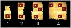 | The complete parchment (4) shows which four boxes must be opened. The smallest (1) shows which box to open first, the parchment with two boxes on it (2) indicates the second box to open, and so on. | |||
