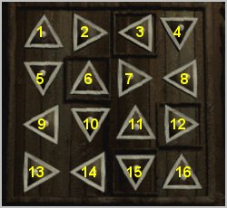 | There are a number of possible sequences, but the simplest is 1, 5, 8 and then 12. After correctly setting the triangle buttons, you hear the drawers unlocking. Open the drawers and take the parchments inside. | |||