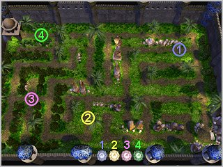 | Insert the orb into the fountain-type device inside the gazebo to activate the unicorn maze. The object of the maze puzzle is to guide the unicorn to safety in the top left corner. The four coloured pagodas at the bottom must be placed in the maze to steer the unicorn onto the correct path. | |||