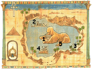 | From the fishing beach (3) go to the Temple with a feather tomb (4). The stone icon, from the fisher boy is used to open the tomb, which, incidentally, has the exact same markings as that of Tutankhamen. Inside the tomb are nine different coloured feathers. Only one feather can be taken on the ship, so you need to find the heaviest one, i.e. it must be 'heavier than Pharaoh's soul'. | |||||||||||||