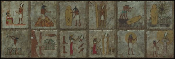 | From the High Priest (1) travel to the Temple of Isis (2). The tiles need to be arranged to reconstruct the story of Osiris. The top tiles depict the story graphically and the bottom tiles are the actual storyline. | |||||||||||||