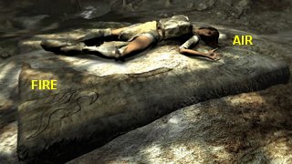 | After falling down a hole (while venturing into the caves) the archaeologist's body rests on a large stone slab. For this part of the game you control her spirit. Take note of the strange symbol on each of the four corners of the slab, they are relevant later. | ||||