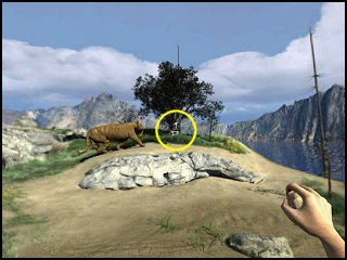 | Walk along the water's edge and pick up the tree stump lying in the grass. To get to the sabre-tooth tiger, place the stump in front of the tree, climb along the tree which bends, allowing you to cross. Once across the water, check the ground carefully and pick up the stone. | ||||